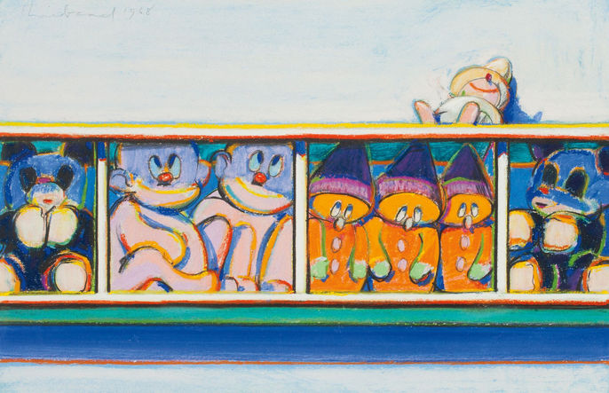 Often categorized as a New York Pop artist, Thiebaud does not identify himself as such, having begun his paintings of quotidian American scenes in the mid 1950’s well before the explosion of Pop art. Mark Rosenthal, the author of this exhibition’s catalog, posits that Thiebaud has more in common with the traditions of Realism and Impressionism, nodding to masters like Eakins, Degas, and Cézanne in his modernist depictions of the American vernacular. Rosenthal observes that Thiebaud’s paintings are deceptively complex, as one begins to realize that his “evolution has not been a matter of one subject replacing the other, but a series of moves and returns so that each work is simply of a piece. Moreover, Thiebaud never stops intersecting with art history, whether vis-à-vis the modernist still life or an obsession with a single grand landscape.”* This exhibition affirms Wayne Thiebaud's range of technique and ingenuity that distinguishes him as an exceptional American artist.